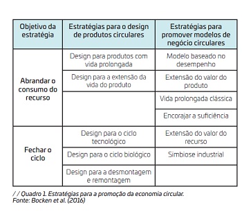 Para melhor se entender o que é a economia circular importa compreender quais são as estratégias existentes para a promover. De acordo com Bocken et al. (2016), as estratégias de economia circular dividem-se em dois grupos: estratégias para desenvolver produtos circulares e estratégias para desenvolver modelos de negócio circulares, estando as estratégias detalhadas no Quadro 1.