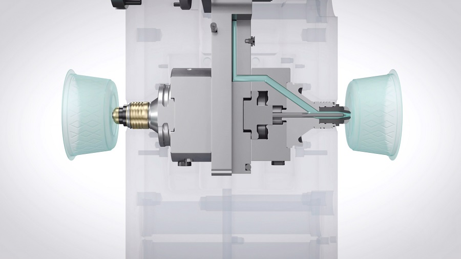 A solução inovadora com patente pendente, em breve disponível no mercado, permite a injeção rápida e os tempos de ciclo num processo estável com alta consistência de peso da peça. Além disso, a montagem e a manutenção são simplificadas e altamente eficientes graças a uma instalação de ligação instantânea, evitando assim paragens longas e dispendiosas. O sistema, que possibilita a utilização de máquinas injetoras menores, adapta-se a uma espessura máxima de placa de 220 mm e a uma distância mínima de 260 mm de porta a porta de bicos coaxiais.
