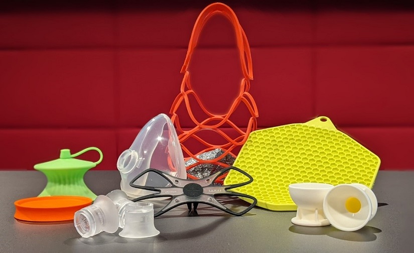 Nos últimos anos, surpreendentemente, a comparação entre a simulação e a realidade têm sido regularmente apresentadas em público nas máquinas de injeção em funcionamento em feiras comerciais como Fakuma, K ou DKT. A imagem mostra várias peças feitas por injeção de projetos diferentes, multicompetente com LSR e HCR. Sem uma rede de fabricantes de moldes, fornecedores de equipamento e de matéria-prima líderes na indústria, isto não teria sucedido. A maioria dos parceiros envolvidos também utiliza SIGMASOFT® com chave de sucesso nas suas próprias empresas para produtos deste género. Com o apoio dos fornecedores de matéria-prima, foi construída ao longo dos anos uma ampla base de dados de materiais de silicone. Ela torna as previsões da simulação ainda mais exatas e permite mudanças virtuais rápidas do material.